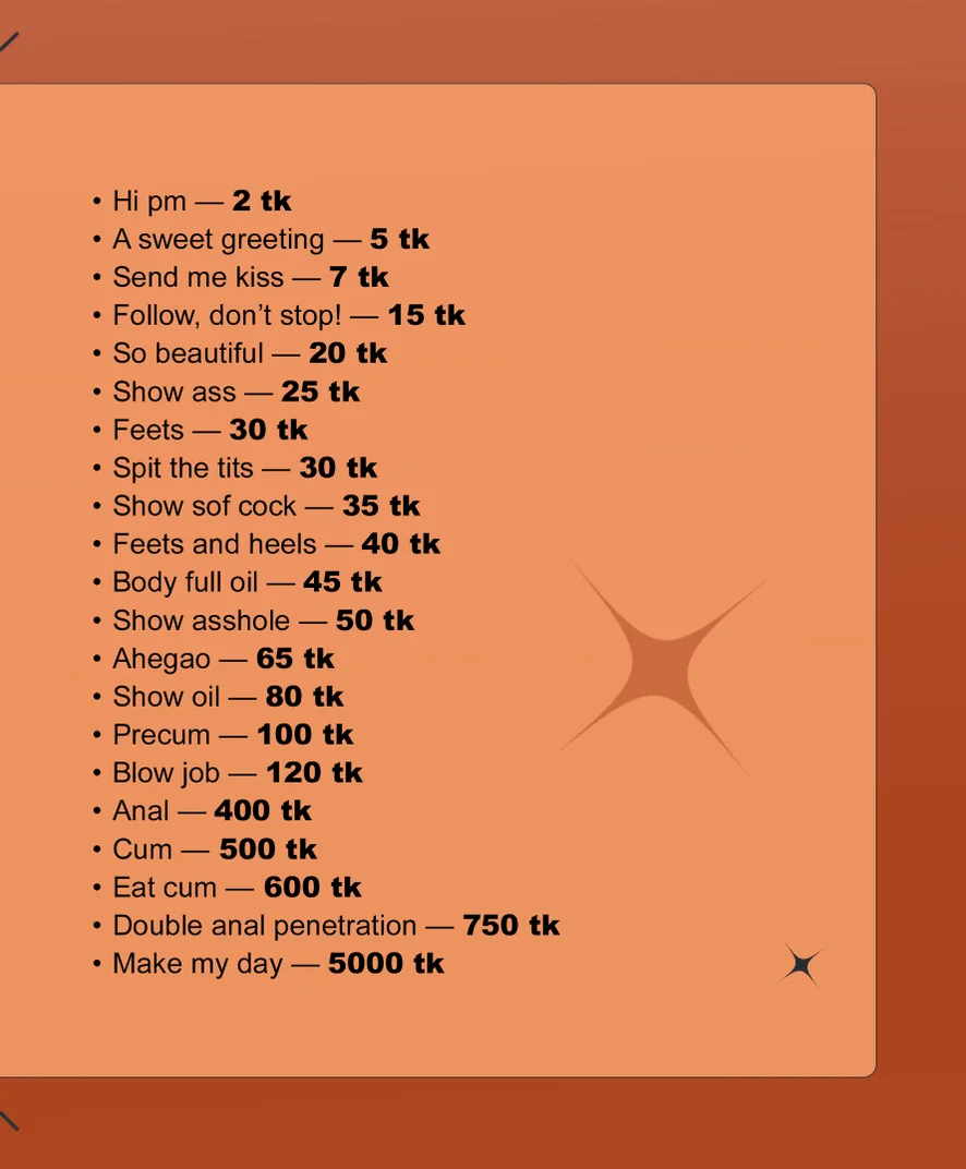 Ahegao, Ερωτικός χoρός, Cumshot, Στα Τέσσερα, Spanking, Βαθμολόγηση πούτσου, Κορσές, Δερμάτινο, Δονητής, Ποδολαγνεία, Βαθύ λαρύγγι, Οδηγίες αυνανισμού, Παιχνίδι Ρόλων, Βρώμικο παιχνίδι, Πρωκτικά παιχνίδια, Βρωμόλογα, Δάχτυλο, Αυνανισμός, Handjob, Χορός twerk, CEI, Κώλος σε στόμα, Μπάνιο, Στριπτίζ, Παιχνίδια του σεξ, Λάτεξ, Προχύσια, Τσιμπούκι, SPH, Γαμήσι στα βυζιά, Ταπείνωση, Δαχτυλίδι πέους, Κάπνισμα, Μασάζ, Gagging, Οργασμός, Ποδομαλακία, Άγριο, Σόου με λάδι, Τακούνια, Γυμνόστηθα, Cowgirl